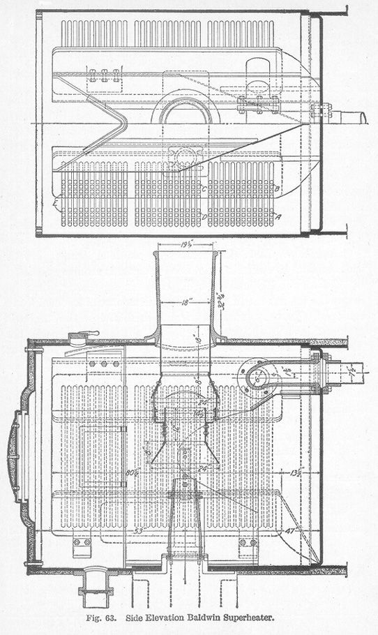 Schenectady or Cole Superheater. The Schenectady superheater was developed by the American Locomotive Company. It has had a large application in recent years and good results are being obtained. The general arrangement and construction of this superheater is shown in Fig. 60 and Fig. 61.