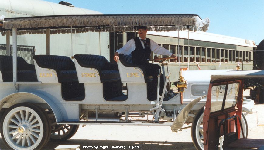 The 1912 Julian Stage hauled passengers to Julian from the end of the railroad line at Foster. Foster was the eastern end of the the line out beyond Lakeside (now under water below San Vicente dam). The Stage belongs to the Julian Historical Society and the restoration work was done at Campo at the Motor Transport Museum. These photos were taken just after the completion of its restoration.