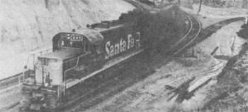 An eastbound Santa Fe freight, lead by SD-24 #916 and five more road units, winds through the final curve leading into the railroad settlement of Summit at the top of Cajon Pass.