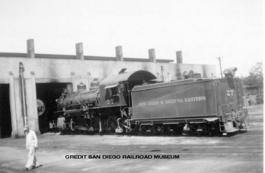 San Diego and Arizona Eastern Railroad #27. In the background is the San Diego engine house. The man on the left is a school teacher by profession but works at railroading because he loves it.