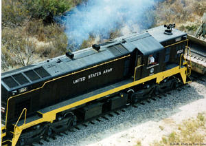 This multi-gauge road switcher trained military railroad personnel, served on frozen Canadian tundra and hot western deserts, and was painted in four different paint schemes --- all of them black!Built by Electro-Motive Division of GM, LaGrange, IL; March 1952